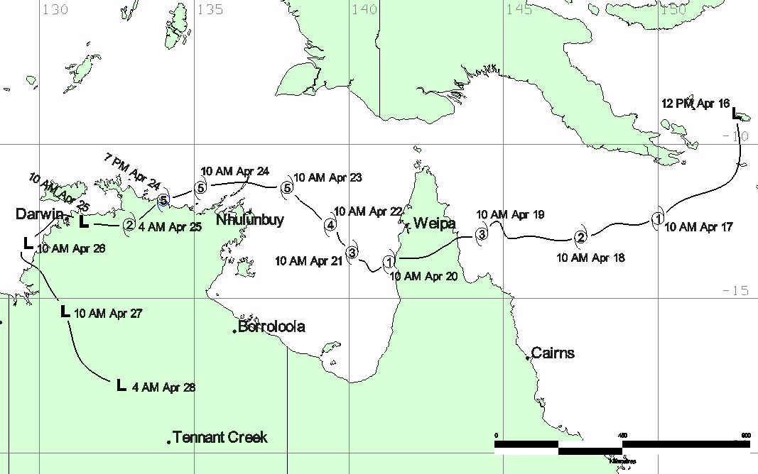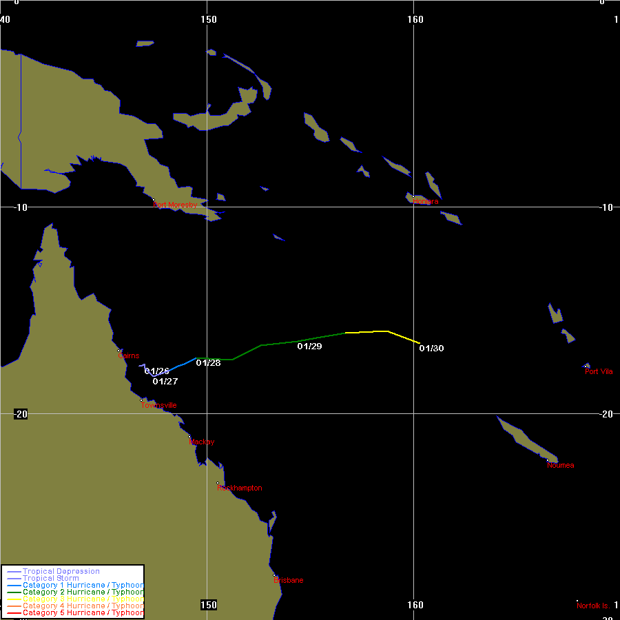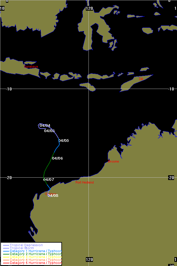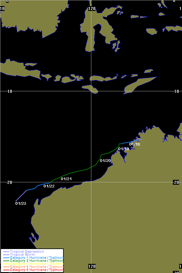 | Monica | both | 0623 | 16 - 26 Apr 2006 | Map | Warn | 200512 | Map | Warn | Event description | BoM Report | |