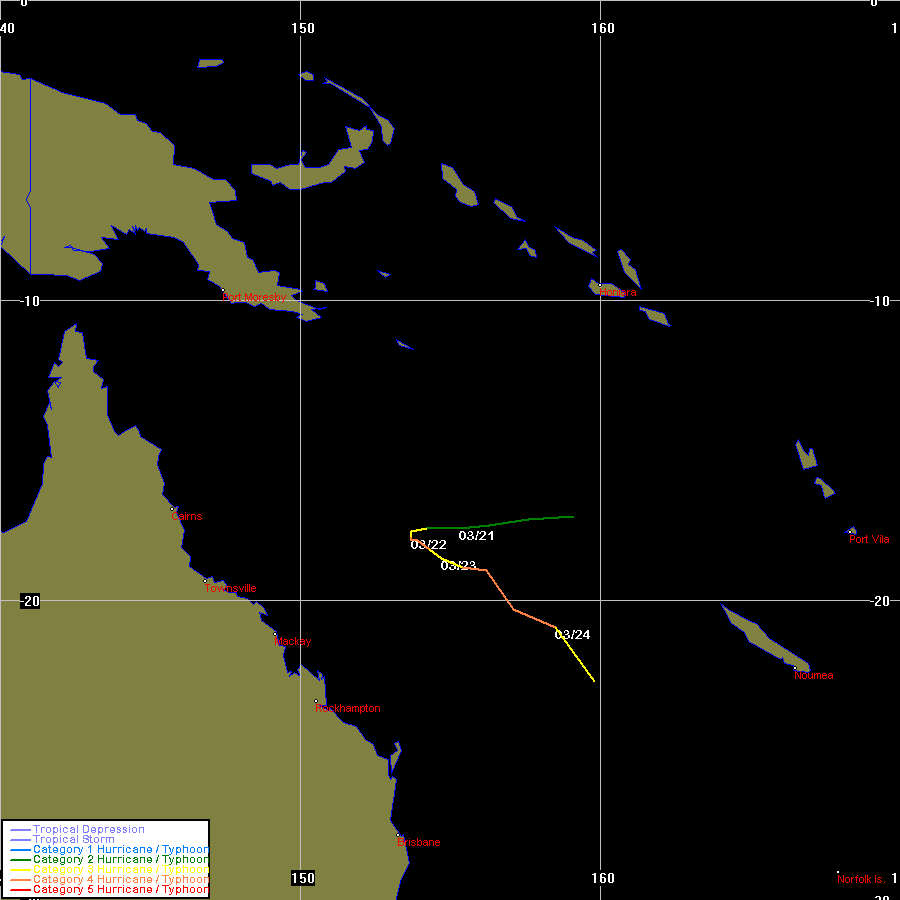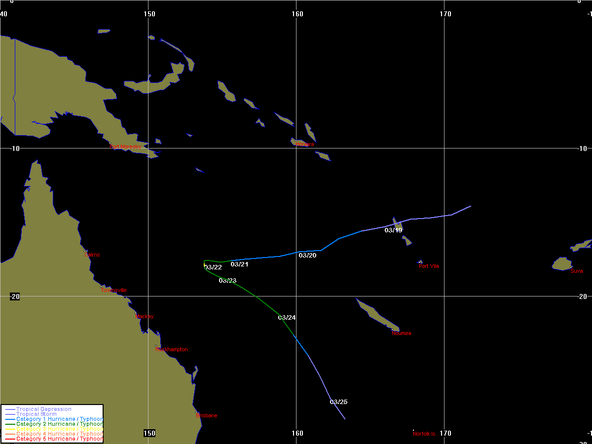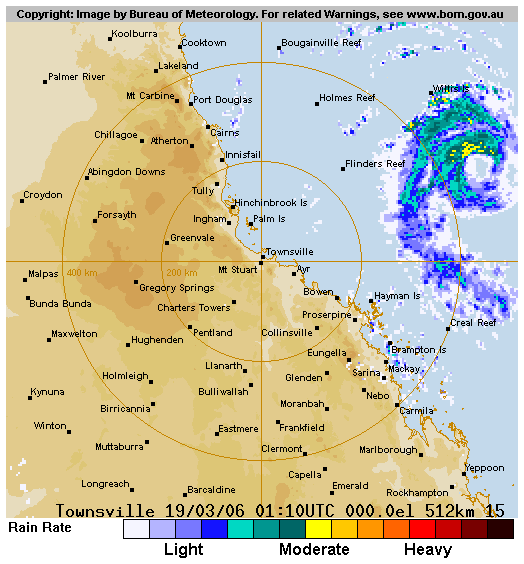 | Larry | SPAC | 0617 | 16 - 21 Mar 2006 | Map | Warn | 200510 | Map | Warn | Event description | BoM Report | Larry Forum Report (PDF) Radar Loop: 11am 19th to 10am 20th (local) Satpics (1km VIS): [4.30pm 19th][7.30am 20th] Satpic Loop (IR): 031600z to 032100z |