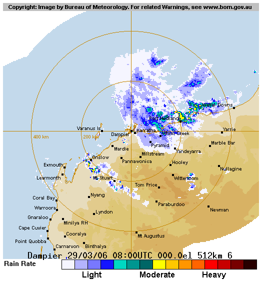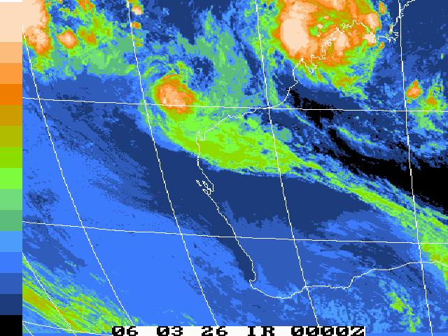 | Glenda | SIO | 0620 | 23 - 31 Mar 2006 | Map | Warn | 200509 | 22 - 31 Mar 2006 | Map | Warn | Event description Radar Loop: 4pm 29th to 11pm 30th (local) Satpic Loop (IR): 032600z to 033100z BoM Report |