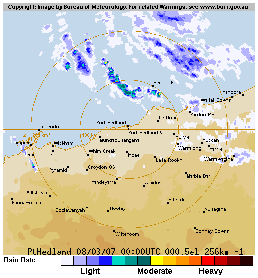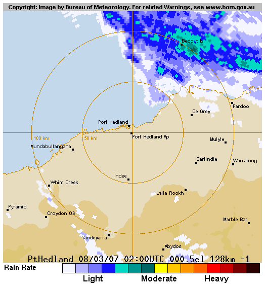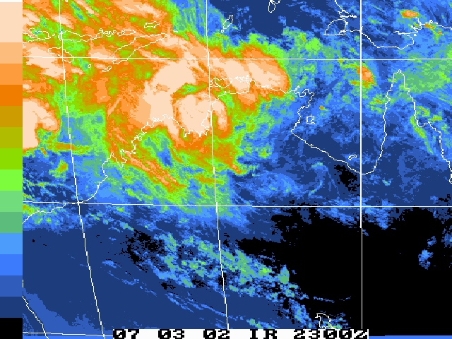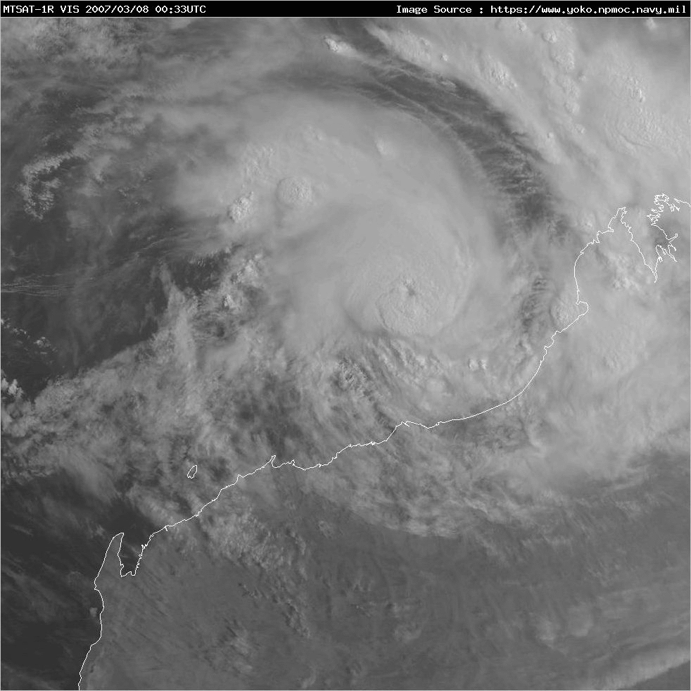 | George | SIO | 0717 | 03 - 09 Mar 2007 | Operational Track | Warn | Map | Warn | BoM report Radar Loops: [02:00 - 13:10z (128km scale)] [02:00 - 13:10z (256km scale)] Satpic Loops: [VIS 01 - 10z (8th Mar)] [IR 03 - 09 March] |