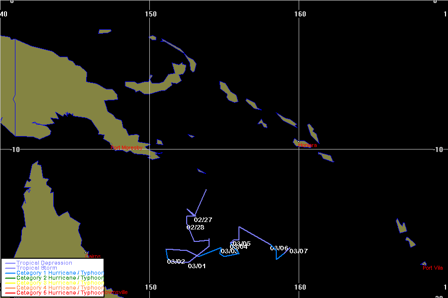 | Odette | SPAC | 03 - 04 Mar 2007 | Operational Track | Map | Warn | Event description | Not tracked by JTWC | Since reclassified by the BoM as NOT being of TC strength. | ||||